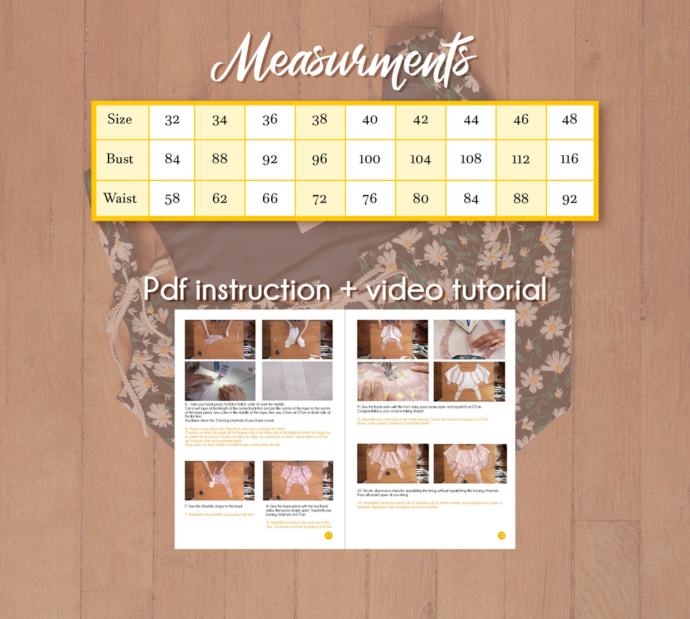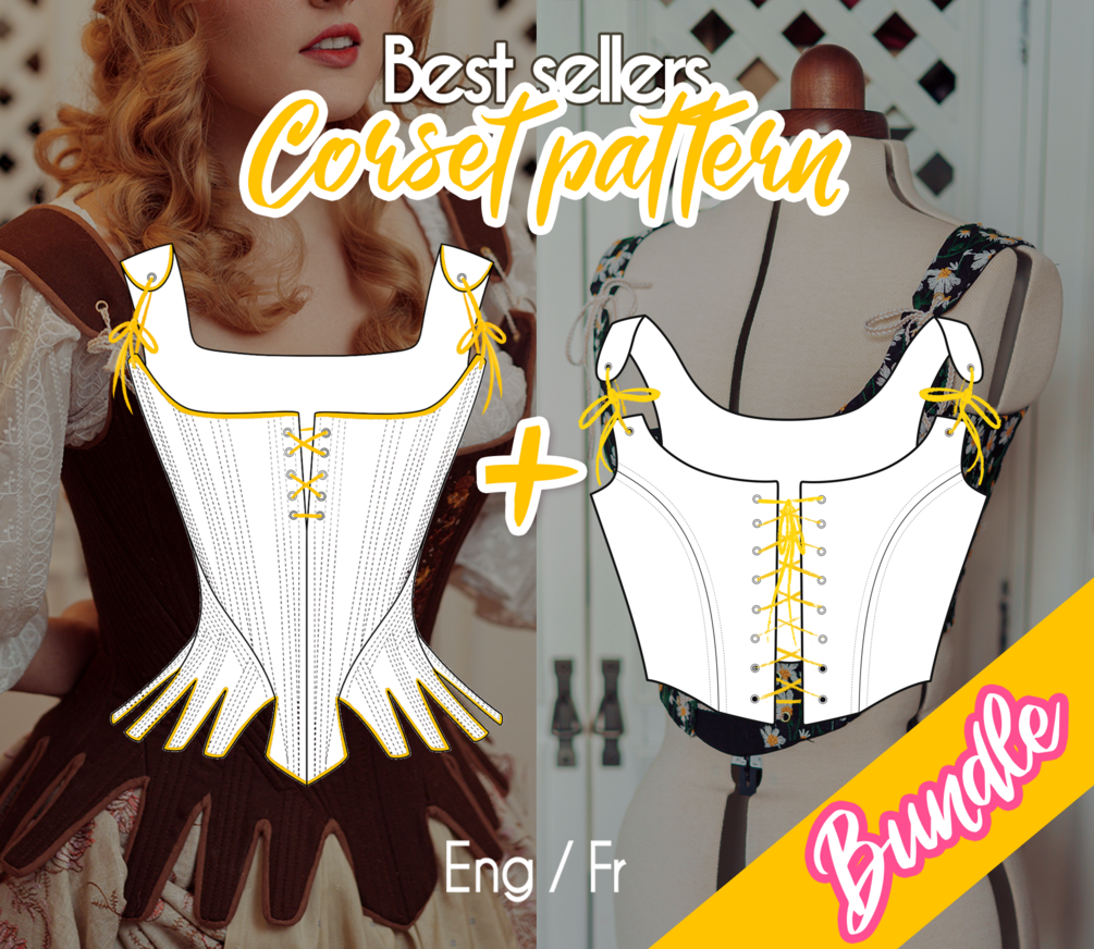 This pattern is based on a genuine pair of stays pattern from 1760. I rework the pieces to adapt it to our moderne bodies and decline it in 3 sizes.