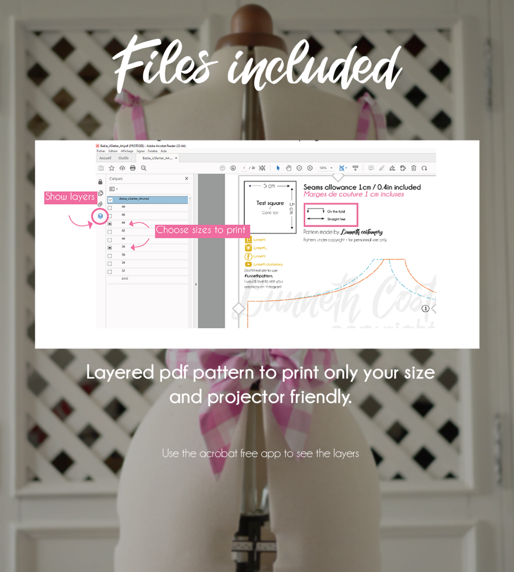 - 2 layered PDF of the pattern to print at home (A4 or US letter size) or with a professional printer (A0 size)